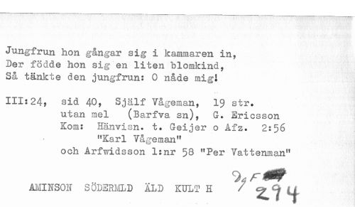 //// Jungfrun hon gångar sig i kammaren in. //// Der födde hon sig en liten blomkind, //// Så tänkte den jungfrun: 0 nåde mig! //// 111:24, sid 40, Själf Vågeman, 1$ str. //// utan mel (Barfva sn), G. Ericsson //// Kom: Hänvisn. t. Geijer o Åfz. 2:56 //// "Karl Vågeman" //// och Arfwidsson l:nr 58 "Per Vattenman" //// AMINSON SÖDERHLD ALD KULT H / ^ ////