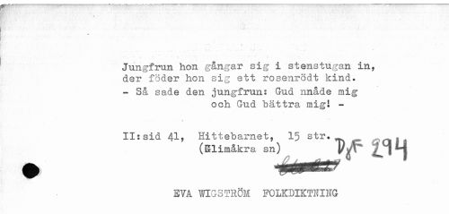 //// -. ^ . //// Jungfrun hon gångar sig i stenstugan in, //// der föder hon sig ett rosenrödt kind. //// - Så sade den jungfrun: Gud nnåde mig //// och Gud bättra mig! - //// II: sid 41? Hittebarnet, 15 str. ^ ^ . //// (Elimåkra sn) t //// HHHt. p^W............. //// ETA WIGSTROM FOLKDIKTNING ////