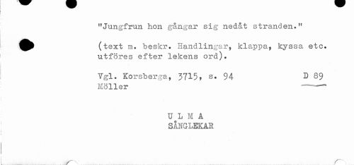 //// "Jungfrun hon gångar sig nedåt stranden." //// . //// ^^ (text m. beskr. Handlingar, klappa, kyssa etc. //// : utföres efter lekens ord). //// Vgl,* Korsberga, 3715? s. 94 D 89 //// Möller —^^ //// U L M A //// SÅNGLEKAR //// ) //// I, ^ r, ////