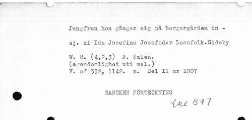 //// Jungfrun hon gångar sig på borgargården in - //// sj. af Ida Josefina Josefsd:r Lassfolk.Sideby //// W. 8. (4,2,3) N. Salen. //// (egendomlighet uti mel.) //// 7. af 352, 1142. m. Del II nr 1007 //// ^ RANCKEN FORTECKNING ////