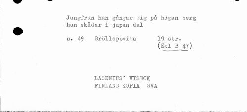//// ! //// < //// Jungfrun hun gångar sig på högan berg //// ^^ hun skådar i jupan dal //// s. 49 Bröllopsvisa 19 str. //// (Ekl B JJ) //// < //// LASENIUS' VISBOK //// FINLAND KOPIA SVA ////