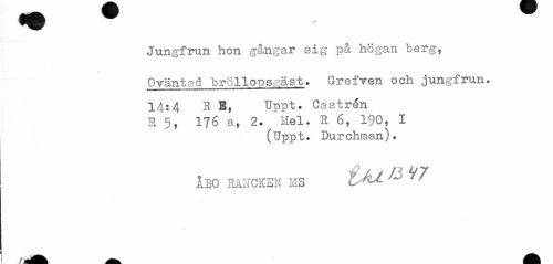 //// Jungfrun hon gångar sig på högan berg, //// Oväntad bröllopsgäst. Grefven och jungfrun. //// 14:4 R B, Uppt. Castrén //// R 176 a, 2. Mel. R 6, 1$0, I //// (Uppt. Durchman). //// ! //// t //// ÅBO RANCKEN MS ^ ^^ ////