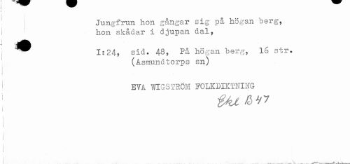 //// Jungfrun hon gångar sig på högan berg, //// i hon skådar i djupan dal, //// 1:24, sid. 48, På högan berg, 16 str. //// (Asmundtorps sn) //// ' EVA WIGSTROM FOLKDIKTNING //// * ////