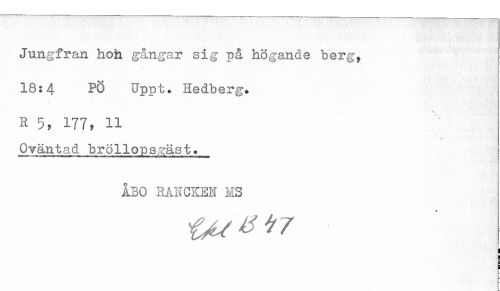 //// Jungfran hoh gångar sig på högande berg, //// 18:4 PÖ Uppt. Hedberg. //// R 177? 11 //// - //// Oväntad bröllopsgäst. //// ÅBO RANCKEN MS ////