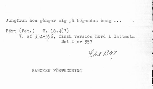 //// ! //// Jungfrun hon gångar sig på högandes berg ... //// Pärt (Pet.) 3. 18.4(?) //// V. af 354*356, finsk version hörd i Sattmola //// Del I nr 357 //// / //// RANCKEN FÖRTECKNING j ////