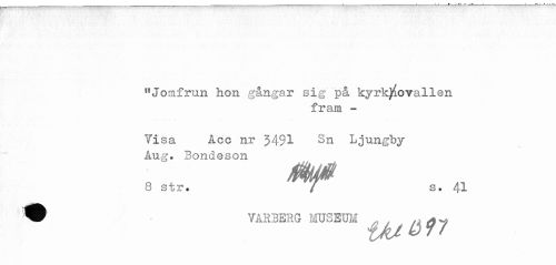 //// "Jorafrun hon gångar sig på kyrk^ovallen //// fram - //// Visa Åcc nr 3491 Sn Ljungby //// Aug. Bondeson //// 8 str. / s. 41 //// ^ VARBERG MUSEUM . , , ////