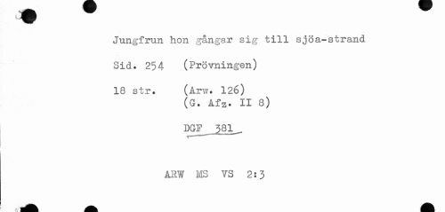 //// Jungfrun hon gångar sig till sjöa-strand //// Sid. 254 (Prövningen) //// 18 str. (Arw. 126) //// (G. Afz. II 8) //// DGF^ 381 _ //// ARW MS TS 2:3 ////