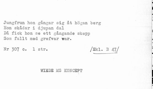 //// i //// H //// Jungfrun hon gångar sig åt högan berg //// Hon skådar i djupan dal //// Då fick hon se ett gångande skepp h //// Som fullt med grefvar war. . //// Nr 307 c. 1 str. /Ekl. B 47/ ^ //// 1 *** i //// WIEDE HS KONCEPT ] ////