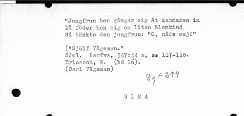 //// "Jungfrun hon gångar sig åt kammaren in //// Då föder hon sig en liten blomkind //// Så tänkte den jungfrun: "0, nåde mej!" //// ("Själf Tågeman." //// Sdml. Rarfva, 347=44 a, ss 117-118. //// Ericsson, -3. (bd 16). //// (Carl Vå^eman) ////