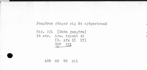 //// - . //// - //// Jungfrun gungar sig åt sjögestrand //// Sid. 221 (Skön jungfru) //// 18 str. Arv/, tryckt 41 //// (G. Afz II 17) //// DGF 241 //// ARW MS VS 2:1 ////