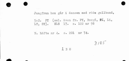 //// Jungfrun hon går i dansen med röde gullband, //// 5:2. PY (mel. även fr. PY, Borgå, PÄ, Li, //// LT, ST). SLS 17. s. 122 nr 98 //// N. häfte nr 4. s. 201 nr 74. //// i ////