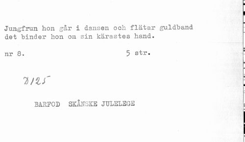 //// ! //// Jungfrun hon går i dansen och flätar guldband - //// det binder hon om sin kärastes hand. //// nr 8. 5 str. //// 3/ar : //// BARFOD SKÅNSKE JULELEGE 5 ////