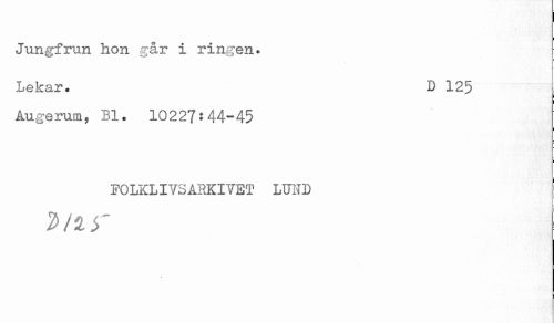 //// Jungfrun hon går i ringen. //// Lekar. D 125 //// Augerum, Bl. 10227:44-45 //// FOLKLIVSARKIVET LUND ////
