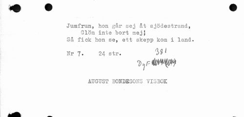 //// Jumfrun, hon går sej åt sjödestrand, //// Glöm inte bort mejj //// Så fick hon se, ett skepp kom i land. //// Nr 7. 24 str. ^' //// AUGUST BONDESONS VISBOK //// * ////