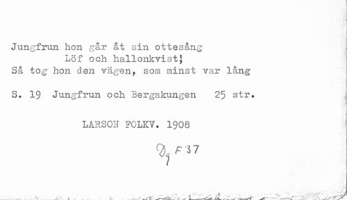 //// < //// Jungfrun hon går åt sin ottesång //// Lof och hallonkvistj //// Så tog hon den vägen, som minst var lång } //// S. 1$ Jungfrun och Bergakungen 25 str. //// LÅRSON FOLKV. 1908 //// ^ ^ ^ 7 //// ... . -- -- * t ... '^.t'!* L ^ ^__. ^ ^ - --- ////