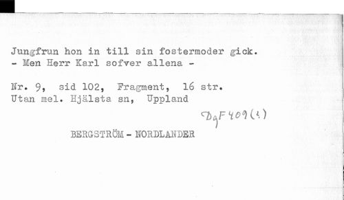 //// Jungfrun hon in till sin fostermoder gick. //// - Men Herr Karl sofver allena - //// Nr. % sid 102, Fragment, 16 str. //// Utan mel. Hjålsta sn, Uppland //// BERGSTRÖM - NORDLANDER ////
