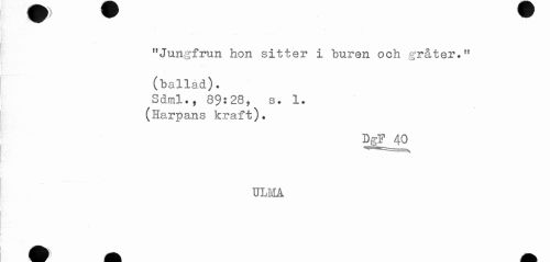 //// "Jungfrun hon sitter i buren och gråter." //// (ballad). //// Sdml., 89:28, s. 1. //// (Harpans kraft). //// DgF^O //// i'. //// ULMA ////