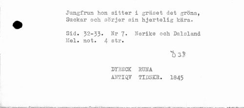 //// Jungfrun hon sitter i gräset det ^röna, //// ^^ Suckar och sörjer sin hjertelig kära. //// Sid. 32-33- ^ 7. Nerike och Dalsland //// Mel. not. 4 str. //// DYBECK RUNA //// ANTIQV TIpSKR. 1845 ////