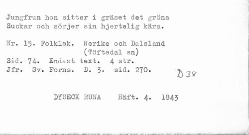 //// Jungfrun hon sitter i gräset det gröna //// Suckar och sörjer sin hjertelig kära. //// i //// < //// i //// Nr. 15. Folklek. Nerike och Dalsland //// (Töftedal sn) //// Sid. 74* Endast text. 4 str. //// Jfr. Sv. Forns. D. 3. sid. 270. ^ ^ //// DYBECK RUNA Eäft. 4. 1843 ////