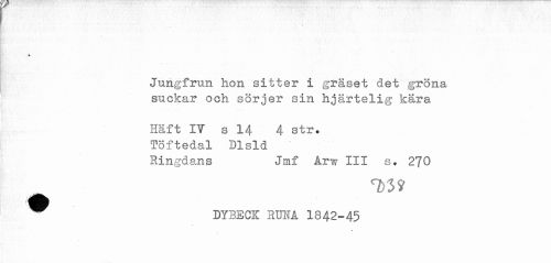 //// . ^ //// Jungfrun hon sitter i gråset det gröna //// suckar och sörjer sin hjärtelig kära //// Häft IV s 14 4 str. //// Töftedal Dlsld //// Ringdans Jmf Arw III s. 270 //// 1)3? //// DYBECK RUI^A 1842-45 ////