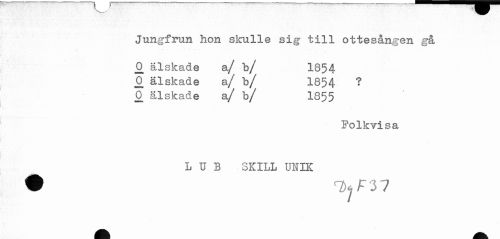 //// Jungfrun hon skulle sig till ottesången gå //// 2 älskade a/ b/ 1854 //// jo älskade a/ b/ 1854 ? //// 0 älskade a/ b/ 1855 //// Folkvisa //// L U B SKILL UNIK ////