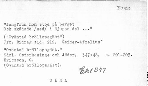 //// "Jungfrun hon stod p& berget //// Och skadade /ned/ i djupan dal ..." //// ("Ovåmtad bröllopsgäst") //// Jfr. Bidrag sid. 212, Geijer-Afzelius' //// "Oväntad bröllopsgäst." //// Sdml. Osterhaninge och Jäder, 347:48, s. 201-203. //// Ericsson, G. //// (Oväntad bröllopsgäst). //// U L 1.1 A : ////