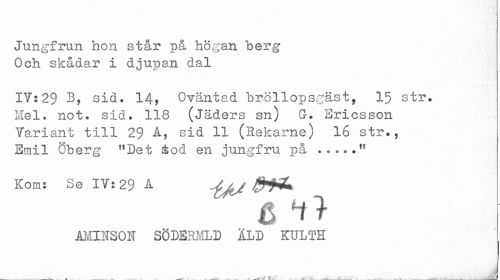 //// Jungfrun hon står på högan berg //// Och skådar i djupan dal //// IV:29 B, sid. 14, Oväntad bröllopsgäst, 1$ str. //// Hel. not. sid. 118 (Jäders sn) G. Ericsson //// Variant till 29 A, sid 11 (Rekarne) 16 str., //// Emil Öberg "Det Éod en jungfru på **..." //// Kom: Se IV: 29 A //// R //// AHINSON SÖDERMLD ÄLD KULTH ////