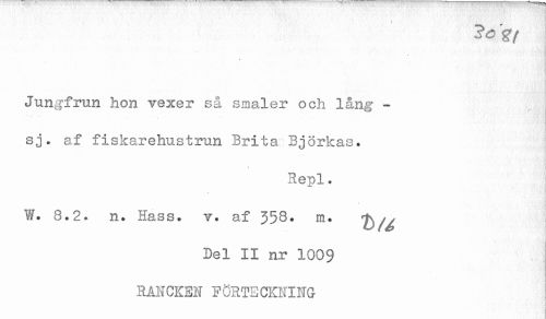 //// sy //// Jungfrun hon vexer så småler och lång - //// sj. af fiskarehustrun Brita Bjorkas. //// Repl. //// < //// W. 8.2. n. Hass. v. af 358. m. ^ //// Del 11 nr 1009 I //// . //// RANCKEN FÖRTECKNING ////