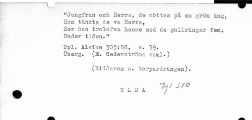 //// "Jungfrun och Herra, de möttes på en grön äng. //// Hon tänkte de va Herra, //// Ser han trolofva henne med de gullringar fem? //// Under tiden." //// Upl. Alsike 303:88, s. 59. //// Öberg. (E. Cederströms saml.) //// . //// (Riddaren o. torpardräng-en). //// ^ U L M A y ////