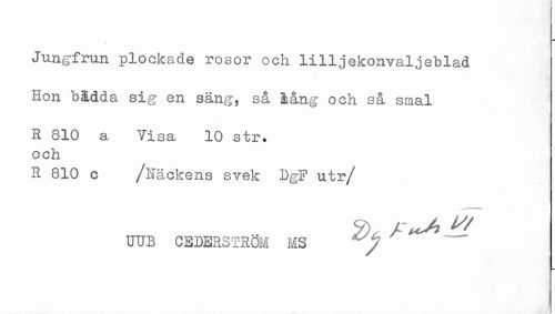 //// Jungfrun plockade rosor och lilljekonvaljeblad //// Hon bädda sig en säng, så &ång och så smal //// R 810 a Visa 10 str. //// och //// R 810 c /Näckens svek DgF utr/ //// UUB CEDERSIRÖM MS ^ ////