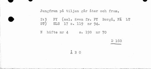 //// Jungfrun på tiljan går åter och fram, //// ^ 2:3 PY (mel. även fr. PY Borgå, PÅ LT //// ST) SLS 17 s. 119 nr 94. //// N häfte nr 4 3. 198 nr 70 //// D 160 //// ÅBO //// ) //// ) ////