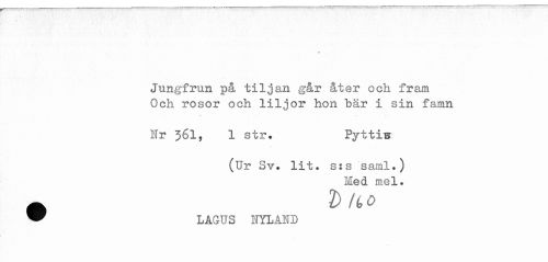 //// Jungfrun på tiljan går åter och fram //// Och rosor och liljor hon bår i sin famn //// - -. - — //// Nr 361, 1 str. Pyttig //// (Ur Sv. lit. s:s saml.) //// Hed mel. //// * LAGUS NYLAND ////