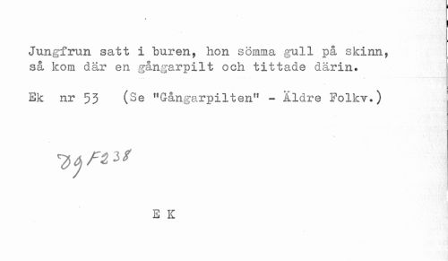 //// / //// Jungfrun satt i buren, hon sömma gull p& skinn, //// så kom där en gångarpilt och tittade därin. //// Ek nr 53 (Se "Gångarpilten" - Äldre Folkv.) //// E K ////