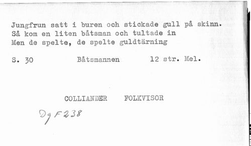 //// Jungfrun satt i buren och stickade gull på skinn. H //// Så kom en liten båtsman och tultade in a //// Men de spelte, de spelte guldtärning ! //// S. 30 Båtsmannen 12 str. Mel. j //// COLLIANDER FOLKVISOR ////
