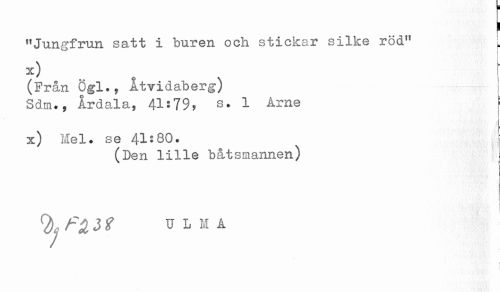 //// "Jungfrun satt i buren och stickar silke röd" //// x) ^ r //// (Från Cgl., Åtvidaberg) //// Sdm.y Årdala, 41^79? s. 1 Arne //// x) Hel. se 41:80. //// (Den lille båtsmannen) //// ! //// ^ ^ J f U L M A ////