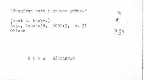 //// "Jungfrun satt i gräset gröna." ^ //// * //// (text o. beskr.) ^ //// Ang., Armndsjöy 2002:3) s. 31 //// Ohlson D §4 //// U L M A SÅFGLE2JYR //// t....___ ... .. ////