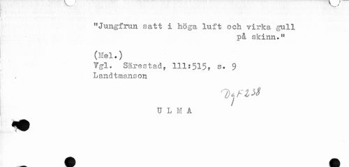 //// "Jungfrun satt i höga luft och virka gull //// på skinn." //// (Hel.) //// i //// Vg-1. Sårestady 111:515? s. 9 //// Landtmanson //// U L M A ////