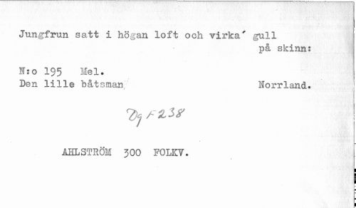 //// Jungfrun satt i högan loft och virka' gull //// på skinn: //// N:o 195 Mel. //// Den lille båtsman Norrland. //// ÅEL STRÖM 300 FOLKV. //// < ////