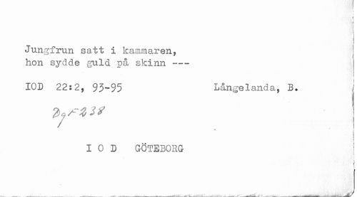 //// t //// { //// f //// } //// Jungfrun satt i kammaren, I //// hon sydde guld på skinn --- //// IOD 22:2, 93-95 Långelanda, B. j //// . i //// T //// t //// IOD GÖTEBORG ! //// * ////
