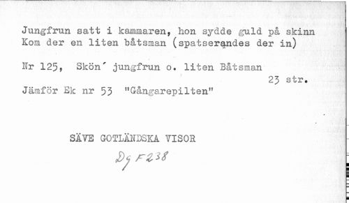 //// Jungfrun satt i kammaren, hon sydde guld på skinn //// Kom der en liten båtsman (spatserandes der in) //// Nr 125, Skön' jungfrun o. liten Båtsman //// 23 str. //// Jämför Ek nr 53 "Gångarepilten" //// SÄVE GOTLÄNDSKA VISOR ////