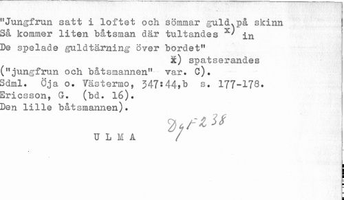 //// "Jungfrun satt i löftet och sömmar guld.på skinn //// Så kommer liten båtsman där tultandes in //// De spelade guldtärning över bordet" //// X) spatserandes //// ("jungfrun och båtsmannen" var. C). //// Sdml. Oja o. Våstermo, 347:44,b s. 177-178. //// Ericsson, G. (bd. 16). //// Den lille båtsmannen). //// U L M A / //// a ////