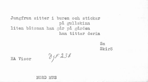 //// Jungfrun sitter i buren och stickar //// på gullskinn //// liten båtsman han går på gården //// han tittar derin //// Sm //// Skirö //// HA Visor //// NORD MUS ////
