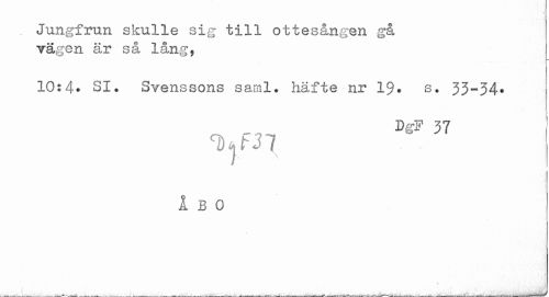 //// Jungfrun skulle sig till ottesången gå //// vägen är så lång, //// 10:4* SI. Svenssons saml. häfte nr 1$. s. 33-34. //// ^ ^^ DgF 37 //// ÅBO ////