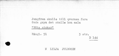 //// ! //// Jungfrun skulle till qvarnen fara //// Goda gryn det skulle hon mala //// "Bota säckar" //// Ringl. 51 3 str. //// D 144 //// N LILJA JULBOKEN ////