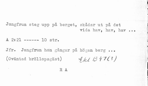 //// ' //// ; //// S //// i //// < //// : //// f //// Jungfrun steg upp på berget, skådar ut på det //// vida hav, hav, hav ... //// J //// A 2:21 --—-.- 10 str. E //// i //// - //// t //// H //// Jfr. Jungfrun hon gångar på högan berg ... //// (Oväntad bröllopsgäst) f //// R A //// j ////