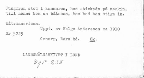 //// Jungfrun stod i kammaren, hon stickade på maskin, //// till henne kom en båtsman, hon bad han stiga in. //// Båtsmansvisan. //// Uppt. av Helge Andersson ca 1$10 //// Nr 5223 //// Genarp, Bara hd. Sk. //// i //// LANDSi,±LSÅRKIVET I LUND //// '' . . . . , . . .. ; .. . j^J ////