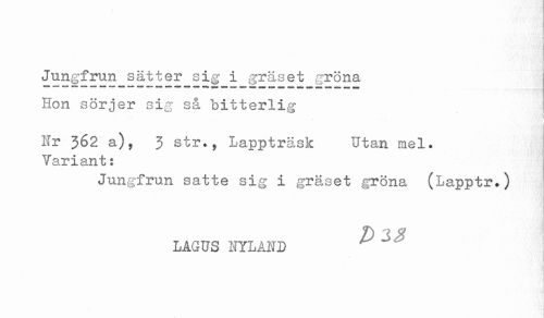 //// Jungfrun sätter sig i gräset gröna //// Hon sörjer sig s& bitterlig //// Nr 362 a), 3 str.. Lappträsk Utan mel. //// Variant: //// Jungfrun satte sig i gräset gröna (Lapptr.) //// 7) J^f //// LAGUS NYLAND ^ ////