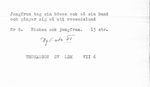//// Jungfrun tog sin bössa ock så sin hund //// och gångar sig så uti rosendelund //// Nr 8. Näcken ock jungfrun. 13 str. //// THOMASSON SV LDM VII 6 //// t //// - ////