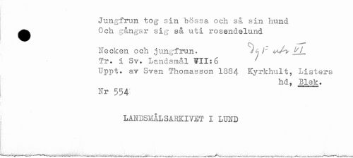 //// Jungfrun tog sin bössa och så sin hund //// j ^^ Och gånger sig så uti rosendelund //// Ne eken och jungfrun. ^ //// Tr. i Sv. Landsmål 711:6 //// Uppt. av Sven Thomasson 1384 Kyrkhult, Listers //// M, Blek. //// Nr 554; //// LANDSMÅLS ARKIVET I LUI^D ////