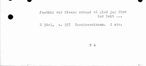 //// Justhär vid älvens strand sa glad jag förr //// ^^ har lekt ... //// ' B $8^2, s. 257 Barndomsminnen. 2 str. //// T A //// _______________________..............................................................:................................................................................................................. ....... ////